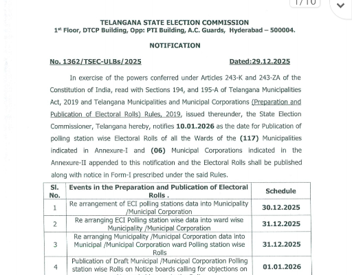 General యాదాద్రి భువనగిరి జిల్లాలోని ఆరు మున్సిపాలిటీలకు ఓటర్ల జాబితా సిద్ధం–షెడ్యూల్ విడుదల చేసిన రాష్ట్ర ఎన్నికల సంఘం 185 READ